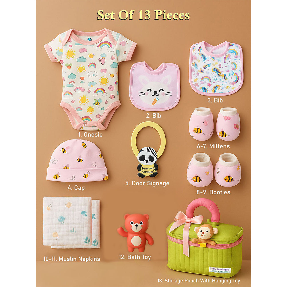 1. 13 Pcs Assorted Gift Hamper Set: This stunning 13 pcs Gift Hamper set is a beautiful assortment of exclusive essentials for a baby girl. This hamper includes • 1 soft satin fabric Pouch with a beautiful handmade felt monkey Toy hanging • 1 Beautifully printed onesie •1 Door Signage •1 newborn Cap • 1 pair of Mittens • 2 Muslin Napkins • 2 Bibs • 1 pair of booties • 1 Toy.