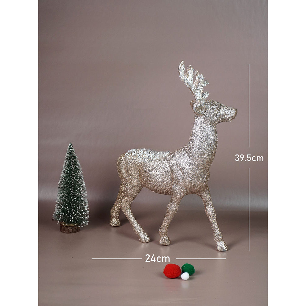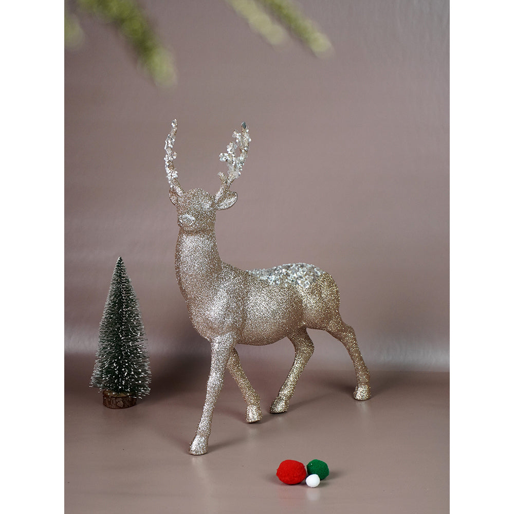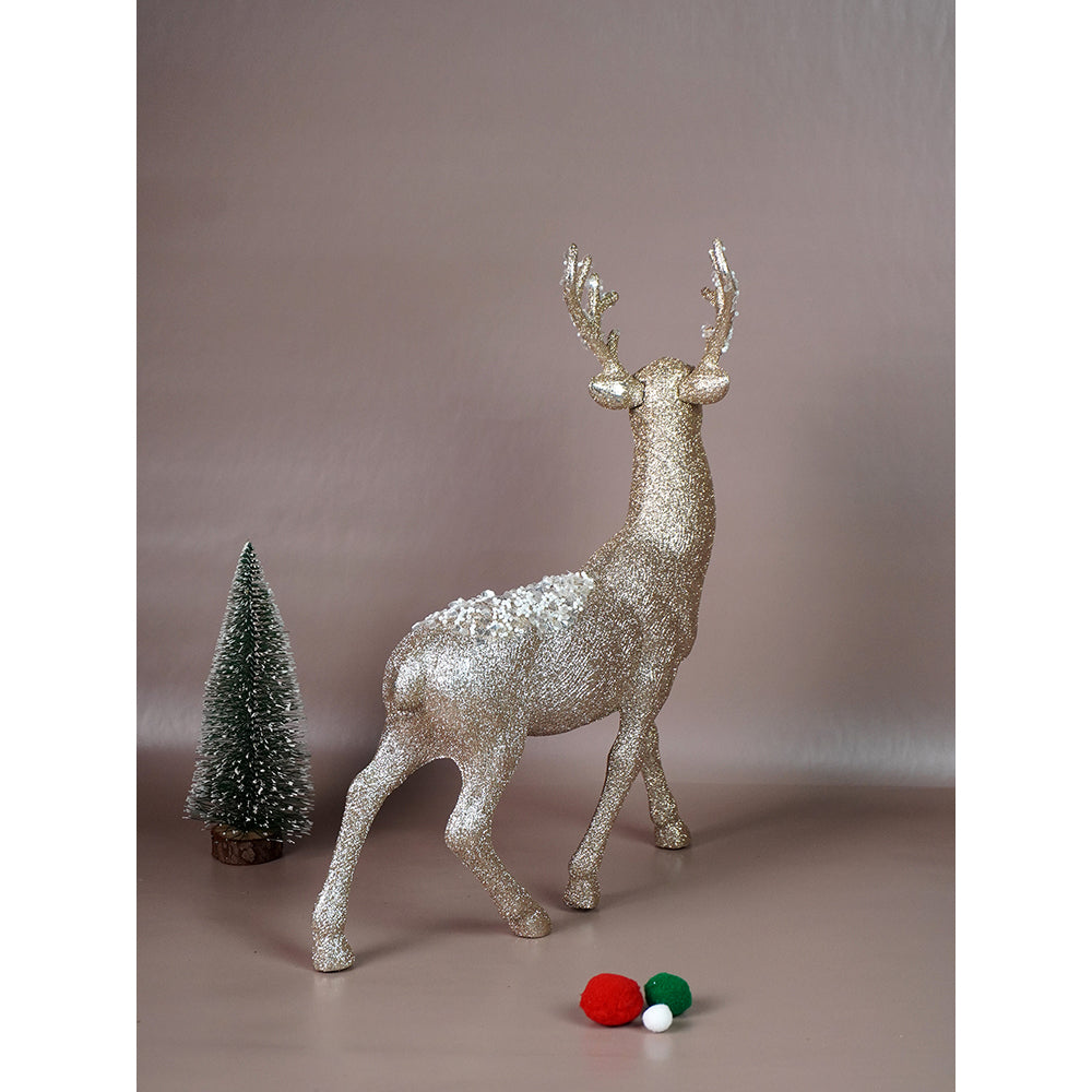 1. Exclusive Premium Design: Bring a touch of festive elegance and sparkle into your home with this champagne Gold Glitter white sequenced christmas Reindeer Figurine. Crafted with exquisite detailing and shimmering gold texture, this timeless décor piece captures the magic of Christmas — adding luxury and charm to any corner of your home.