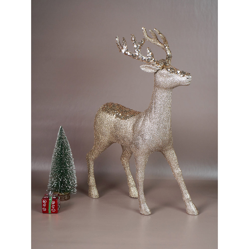 1. Exclusive Premium Design: Bring a touch of festive elegance and sparkle into your home with this champagne Gold Glitter bronze sequenced christmas Reindeer Figurine. Crafted with exquisite detailing and shimmering gold texture, this timeless décor piece captures the magic of Christmas — adding luxury and charm to any corner of your home.