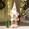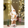 1. Exclusive Design: This elegant Santa, dressed in a soft ivory white fur coat with beige detailing and rich dark gold accents, creates a luxurious and festive Christmas look. With his classic rosy cheeked face, fluffy white beard, and festive hat, he brings a heart warming holiday appeal to your décor.
