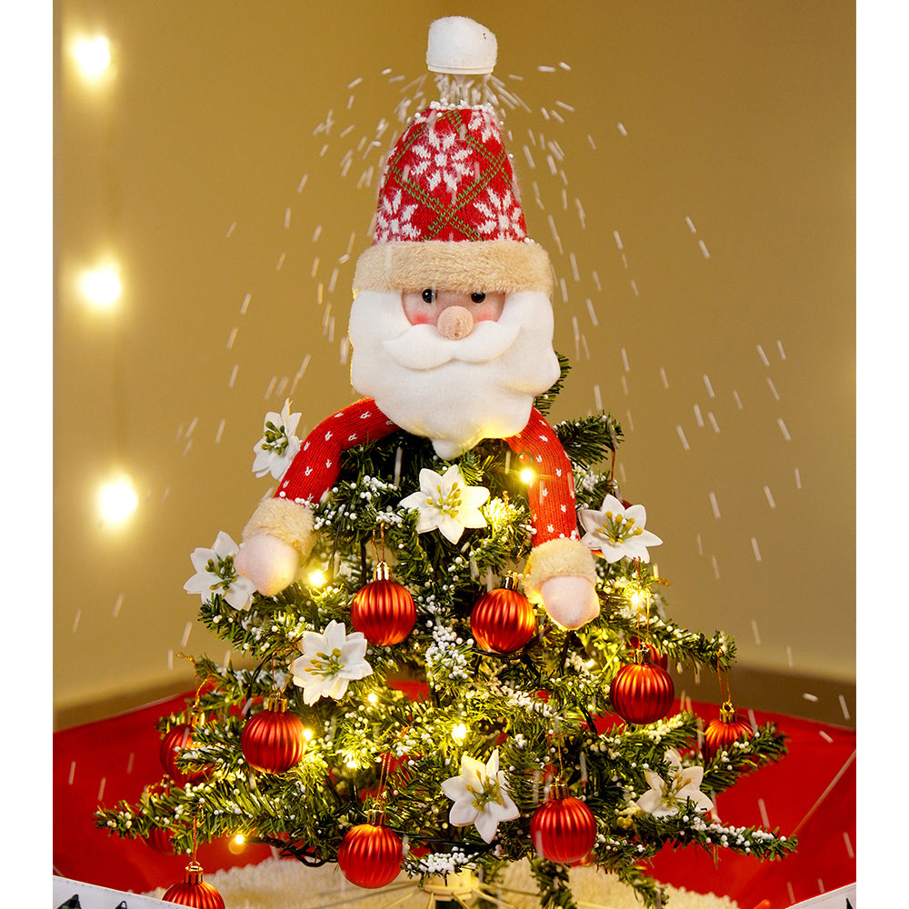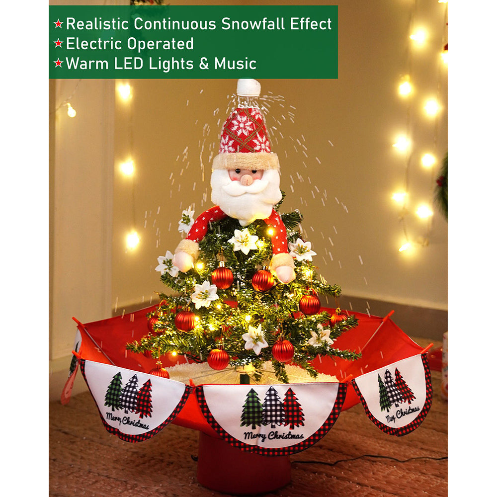 1.Exclusive Luxury Design: A truly unique snowfall décor piece with Music, Lights and continuous Snowfall, making it an instant festive showstopper. Designed as a beautifully decorated Christmas tree with an adorable Santa topper, dressed in festive red with open arms, surrounded by ornaments, pine foliage, and a charming red umbrella-style base for a modern Christmas twist.