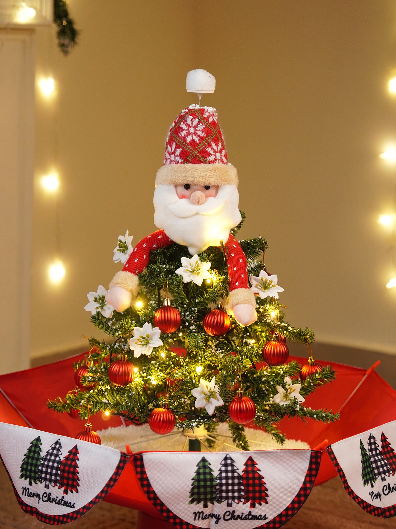 4. Detailed Design: Standing at 2.5 feet, this décor piece features a beautifully decorated, snow-dusted Christmas tree topped with a cheerful Santa figure. The festive red umbrella-themed base adds charm and elevates the visual appeal, making it the perfect centrepiece for holiday celebrations.