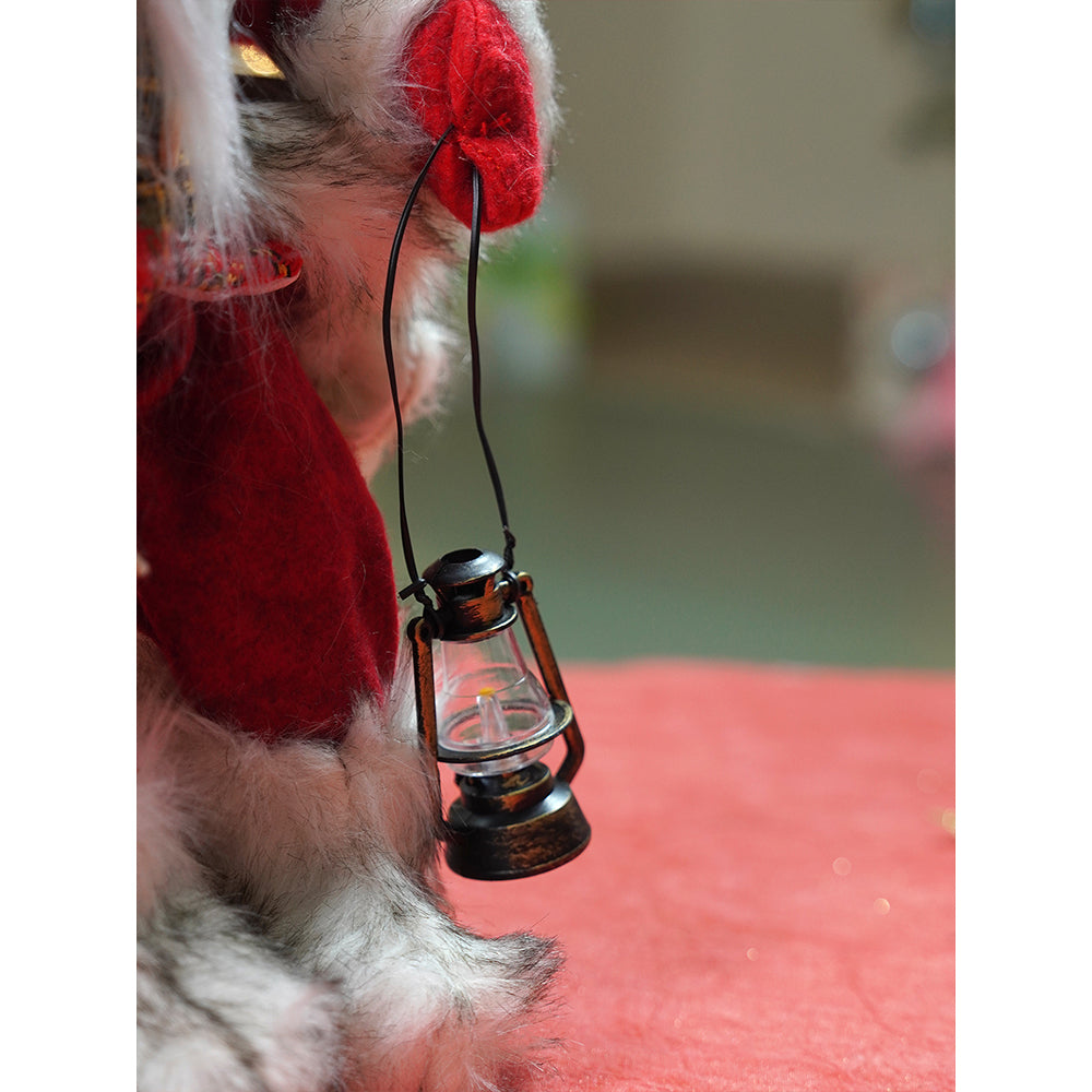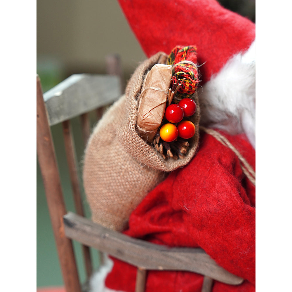2. Detailing: Beautifully crafted with plush fur trims on the coat and boots for a lifelike winter look. Santa holds a miniature lantern in one hand and a rope carrying a sack of miniature gifts in the other, symbolizing light, love, and the joy of giving. The wooden rocking chair which actually rocks adds a nostalgic, heartwarming touch to this festive piece.