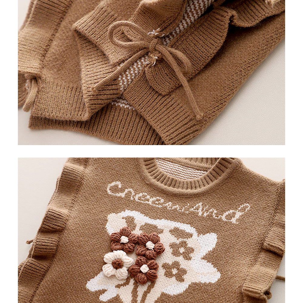 1. Pretty Floral Knit Design: This elegant girls set features a soft brown knitted cardigan with delicate ruffle detailing on the sleeves and floral knit pattern on the front with full-sleeve inner T-shirt with a classic scalloped collar. The cardigan is open at the sides with adjustable tie-up, adding a unique and stylish touch, paired with classic blue denim pants finished with lace trim and cute bow accents near the hem, creating a graceful look.
