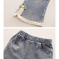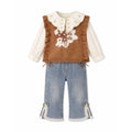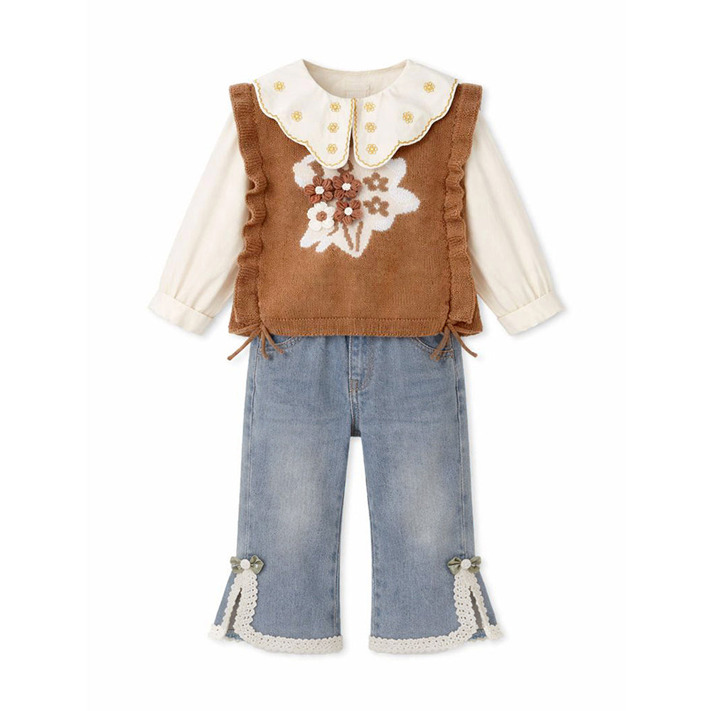 3 Pcs Set,Brown Peter Pan Collared Floral Knitted Cardigan,T-shirt,& Denims Partywear for Girls