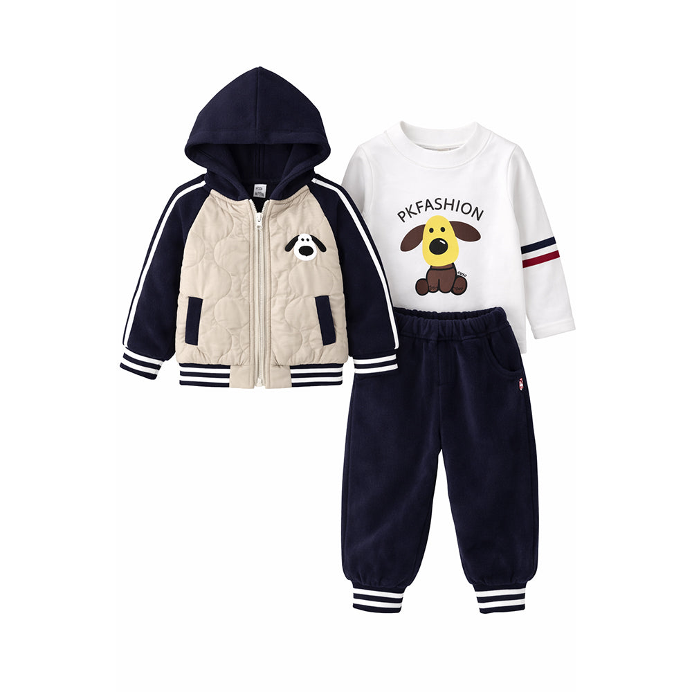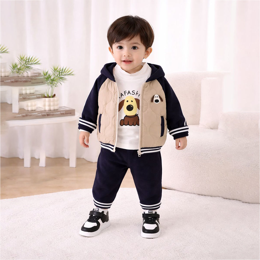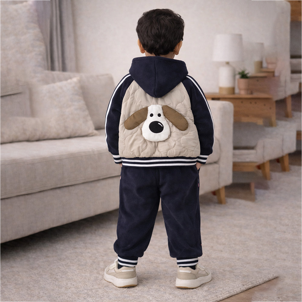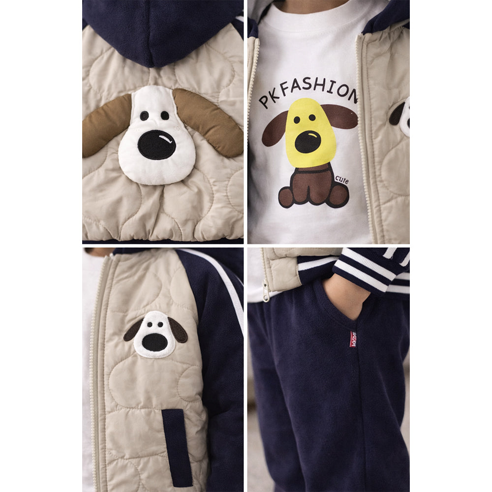 1. Puppy Print Design: This adorable set features a soft white T-shirt with a cute puppy print, layered with a beige padded jacket for added warmth. The look is completed with matching navy blue jogger pants detailed with sporty stripe accents at the cuffs, creating a playful yet stylish everyday outfit.