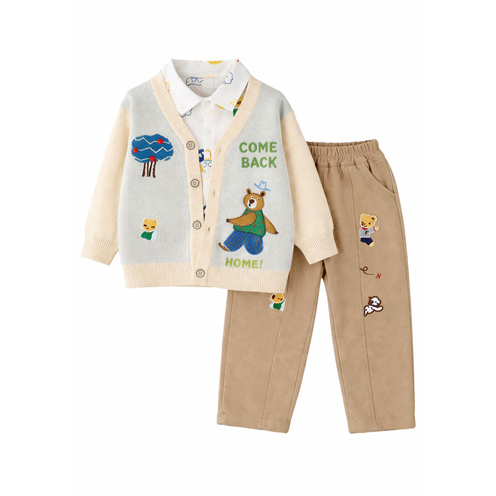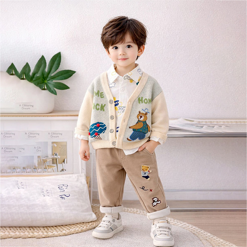 3 Pcs Set,Plane & Sun Shirt,Ted Cardigan & Pants set for Kids