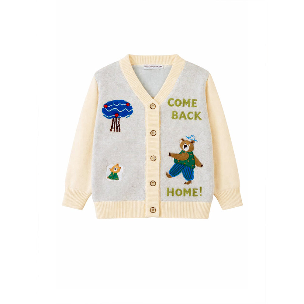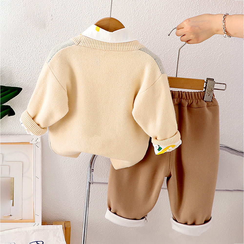 1. Playful Design: This adorable set features a white full-sleeve shirt with playful prints of suns, clouds, and planes, layered with a beige knit cardigan detailed with cute illustrations that add a fun, storybook-inspired charm. It is paired with matching beige pants featuring small, charming illustrations, creating a smart yet cute outfit perfect for little ones.