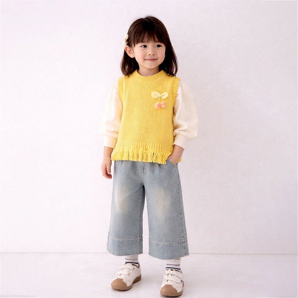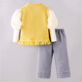 1. Adorable Design: This adorable set features a soft white full-sleeve inner top layered with a yellow knitted sleeveless vest. with cute pom-pom accents and fringe detailing at the hem, adding a sweet and stylish touch. It is paired with classic blue denim pants featuring a relaxed fit, creating a charming look.
