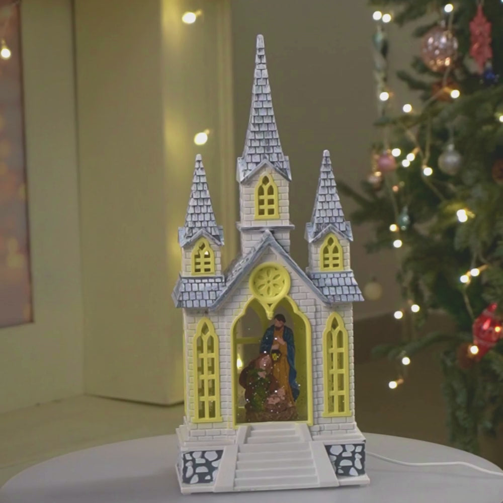 3 Tower Church with Holy Family Decor with Musical Glitter Water, Rotation & Light, Christmas Home Décor