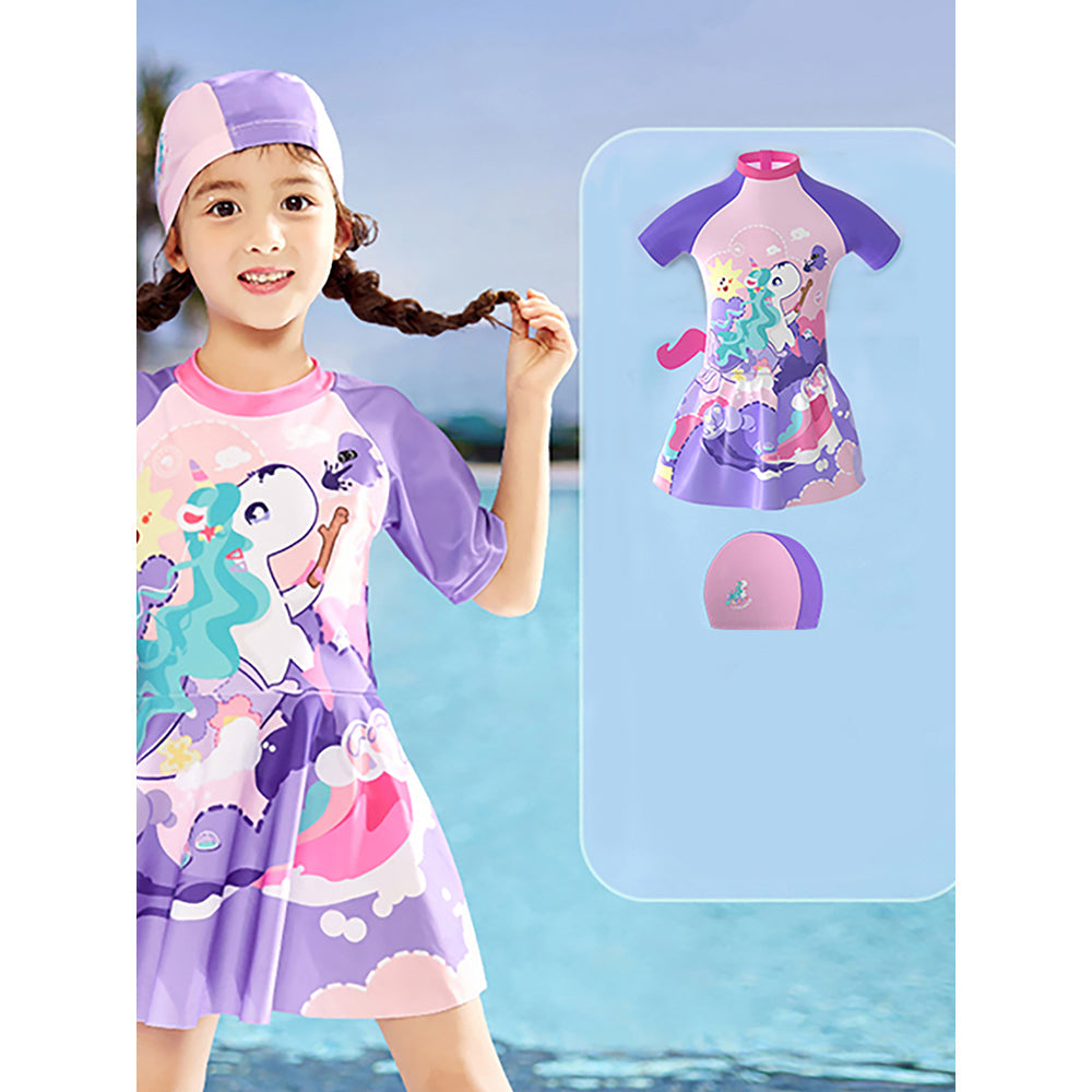 3d Tail Purple Mermaid Unicorn Frock style Kids Swimwear with matching Swim Cap with UPF 50+