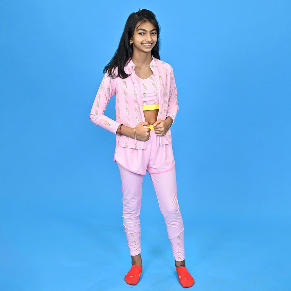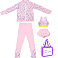3pcs Pink Flower Power Matching Top,leggings & Jacket style Swimwear set for Pre Teens & Teens with Free Washbag
