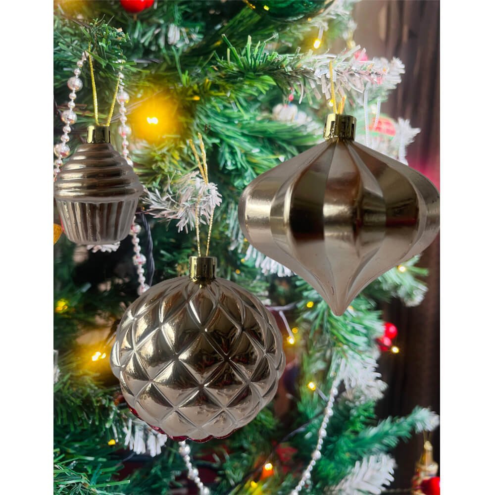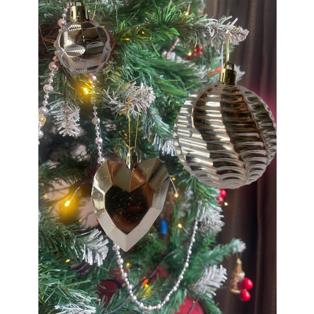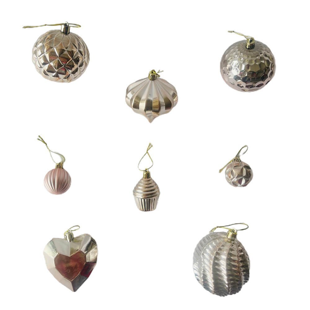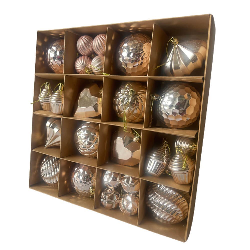 40 pcs Box Set: A premium box set of 40 pieces which offers a good range of mix designs of Christmas Balls in an absolute fun theme and good size in a fresh Rose Gold colour which adds so much of style and grace to any christmas tree .Mix Theme Xmas Balls: The Different designs in this set offer a good mix and range of ornaments for your christmas tree. Self Design Balls, Diamond shape ornament, heart Shape ornament, Mini Cupcakes style ornament, Patterned Balls - a complete mix of all these elements. It?s difficult to not fall in love with the design of each ball.