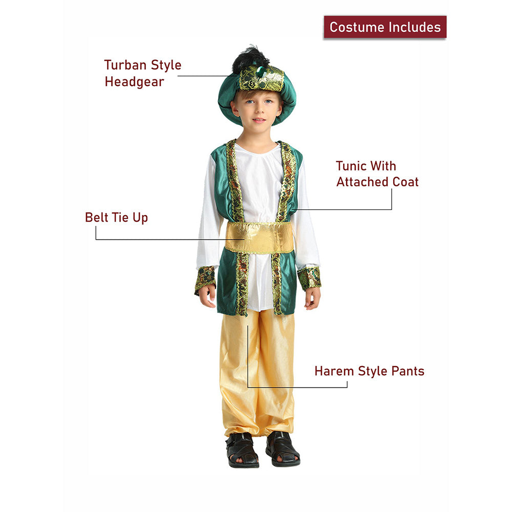 3.Quality: Made of good quality cloth, very comfortable and breathable to wear. Designed for kids to play the role of a regal Aladdin or an arabian Prince.