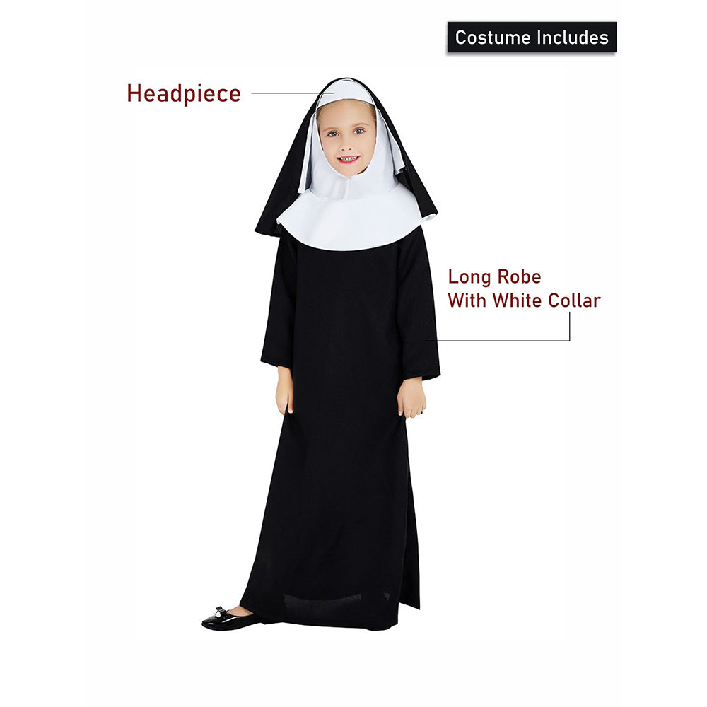 4.Accessories, 2pcs set: 1pc of Black long robe with white collar, 1 matching headpiece,the nun veil with accentuated shoulder flap look giving a perfect Nun look. This nun suit makes it look realistic for any school dress up, church plays or stage performance.