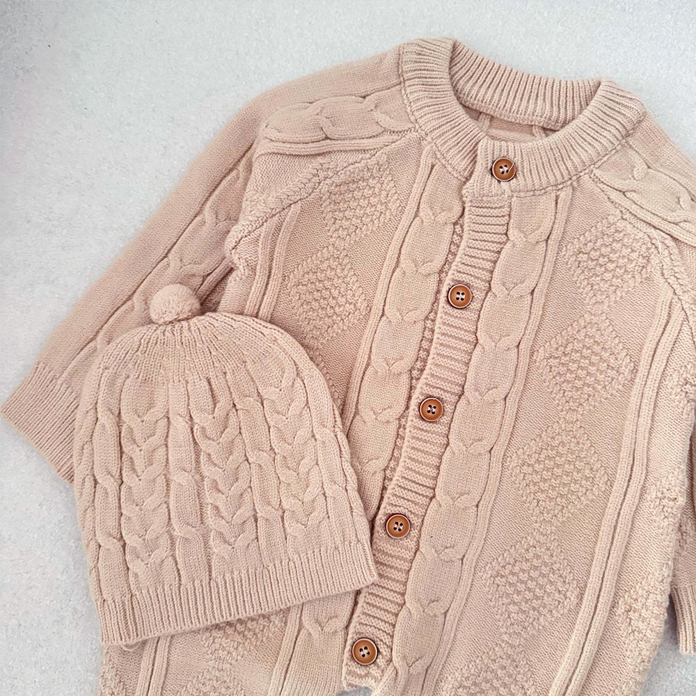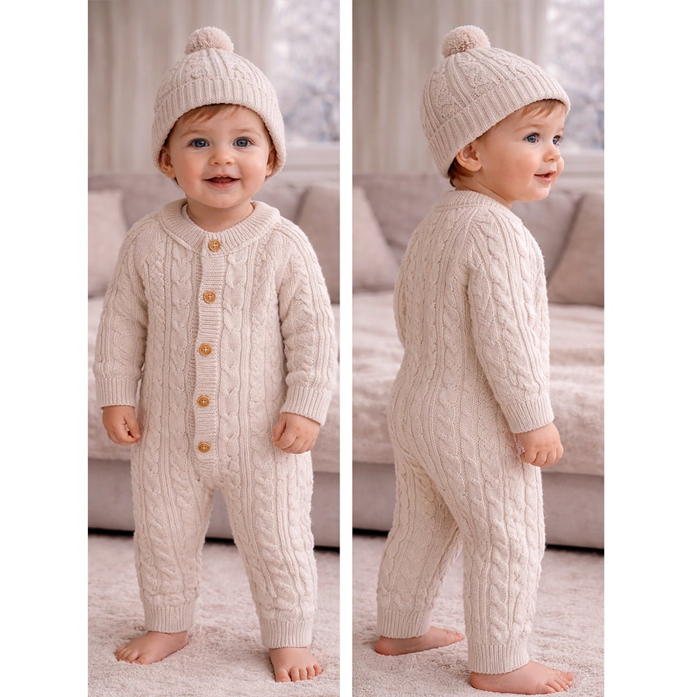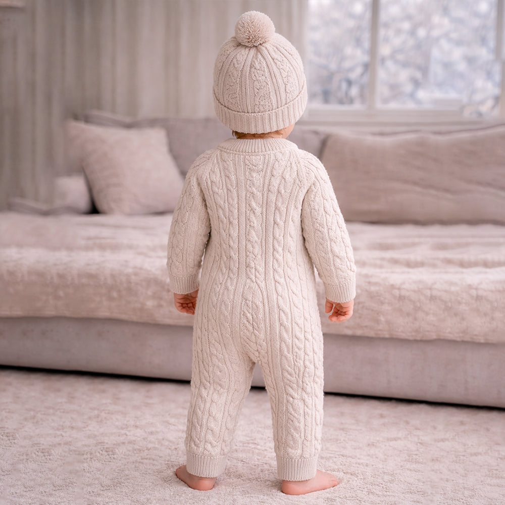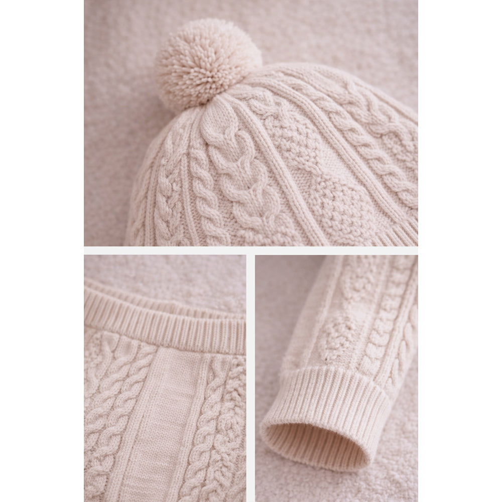 1. Adorable Textured Design with Cap: Dress your little one in this super cute beige cable patterned romper which includes a matching cap with a pompom on top, completing a warm, playful, and picture-perfect winter look.