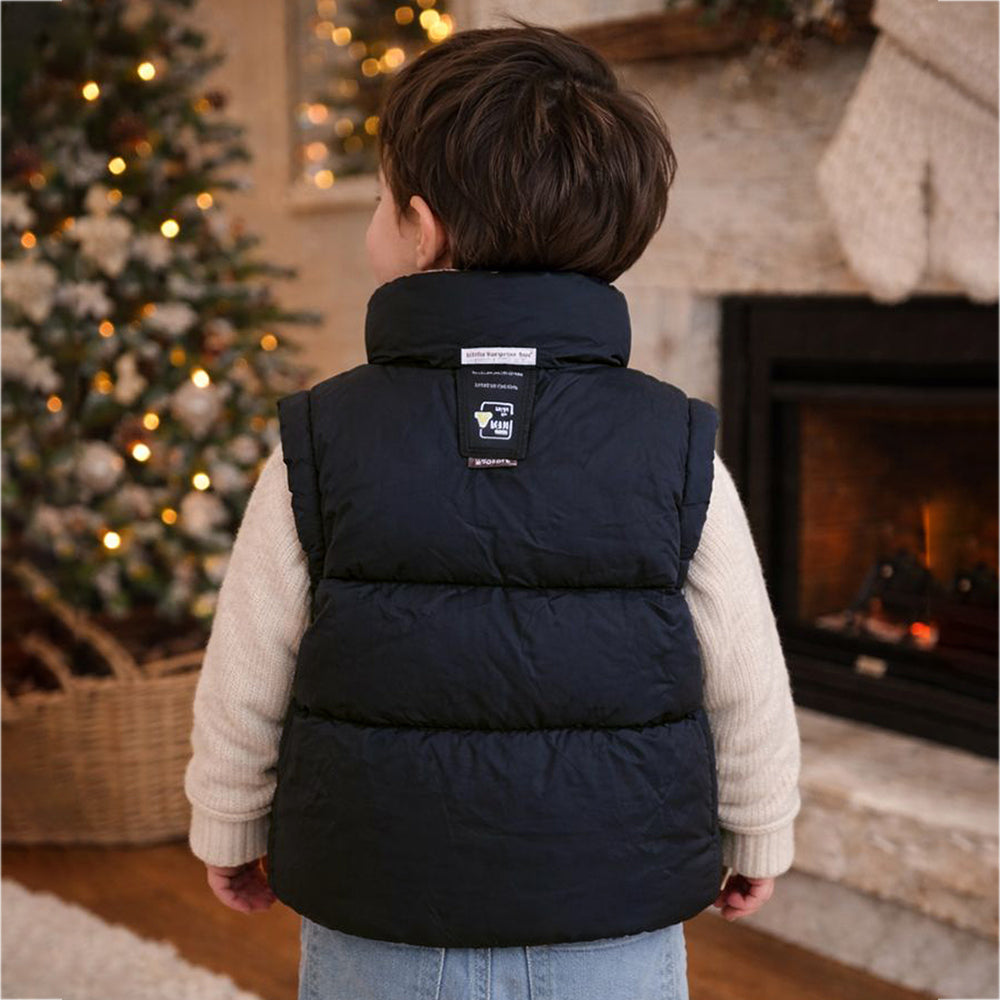 1. Black Jacket with Checked Inner Collar: Designed with a smart checked inner collar that adds a stylish and premium touch, this vest brings both charm and comfort to your child’s winter wardrobe, making it fashionable and winter-ready.