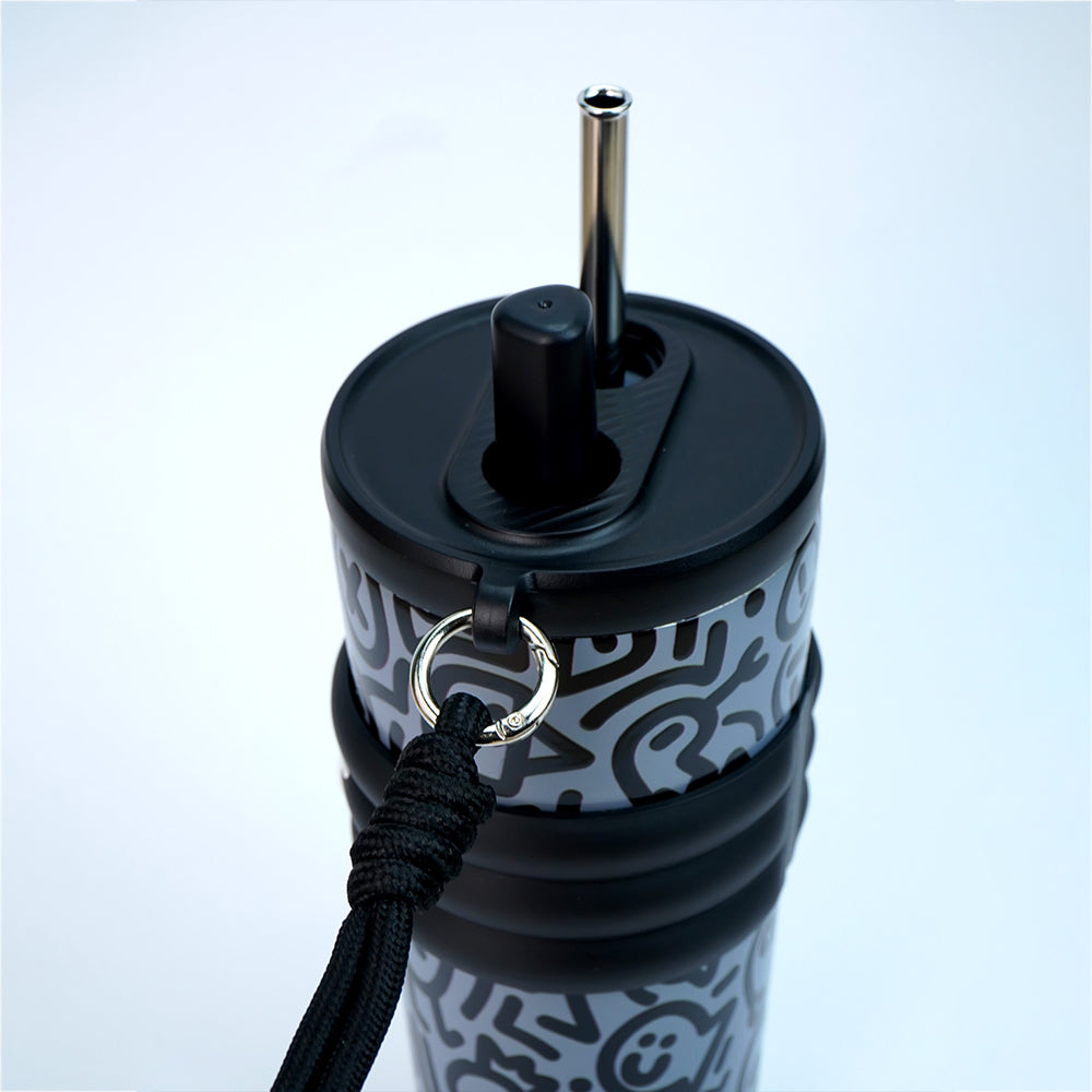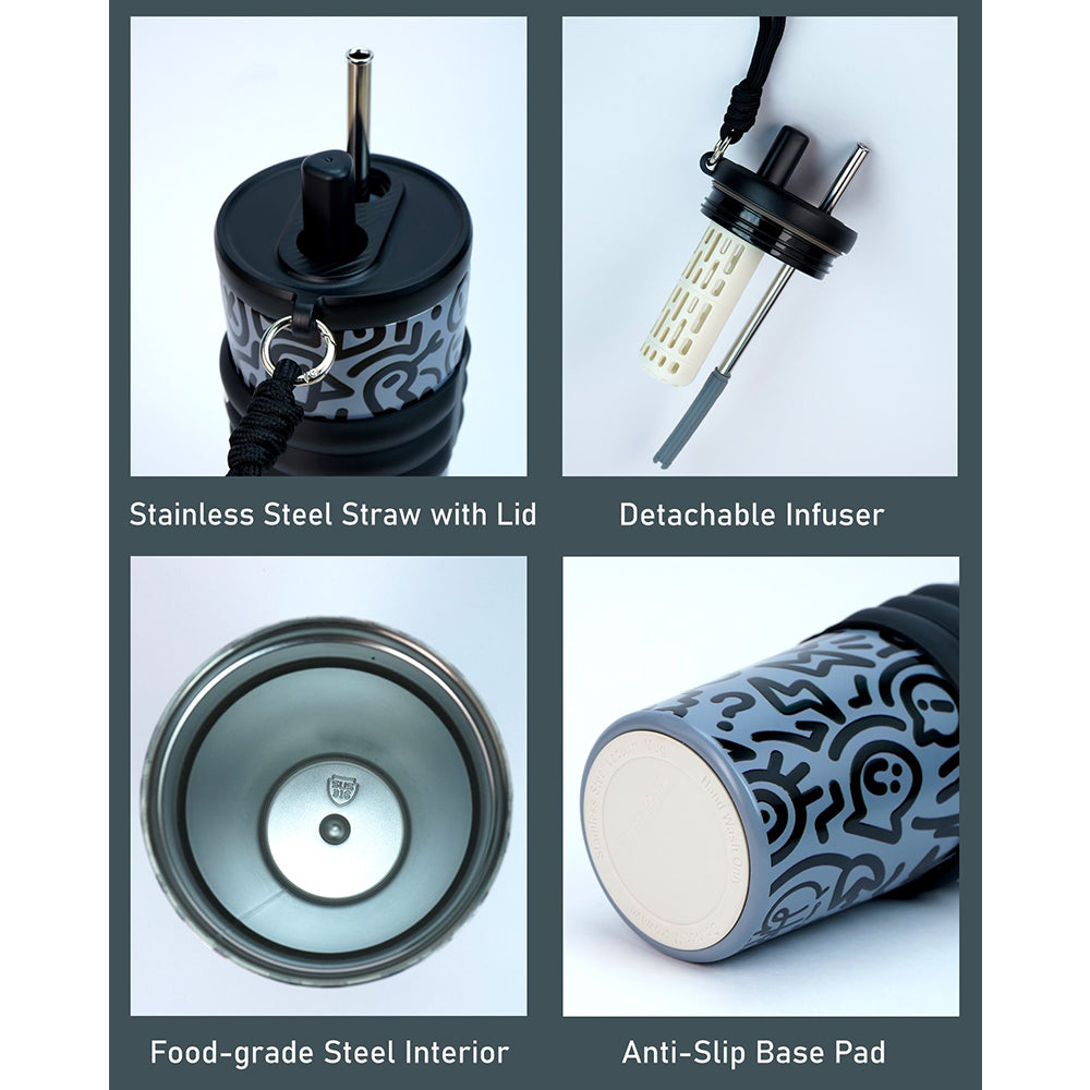 1. Design & Feature: This exclusive bottle is from the fluroscent doodle series collection. The stainless steel straw with a lid makes it really convenient to take in big sips of water with ease .The Black Doodle Monochrome design on a cool grey base gives this bottle a modern, street-style edge. A perfect piece for the ones who love all things truly functional and yet quirky.