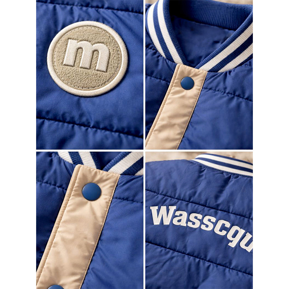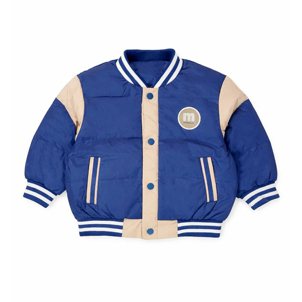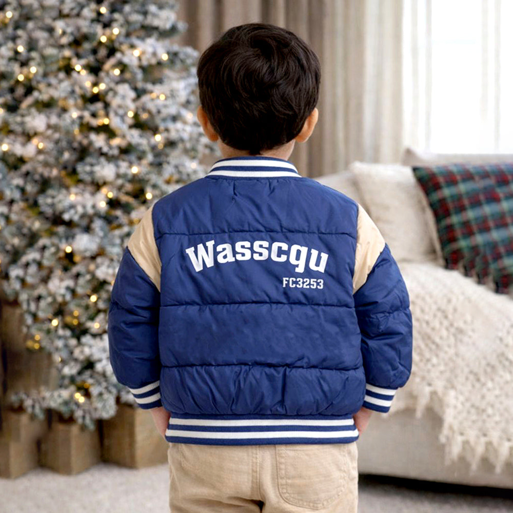 1.Classic Varsity Jacket Design: This stylish blue and beige winter jacket brings the varsity look to your child’s wardrobe. With its colour, contrast sleeves, and sporty detailing, it gives a trendy, college-style winter outfit that kids love.