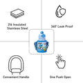 5. Leak Proof & Push Button Lock : Provides triple protection against leaks such as silicone seals, triple threads and safety locks, children can turn the water bottle in any direction (even upside down) without it spilling.