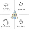 2.Dual Feature Lid Design : This piece is uniquely designed where the child can sip the liquid either through a silicone straw or through a wide mouth. It also has a unique feature of a bottom container below the bottle which fits in well looking like a part of the bottle. The child can transfer some snacks or use this container to pour in hot beverage .