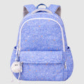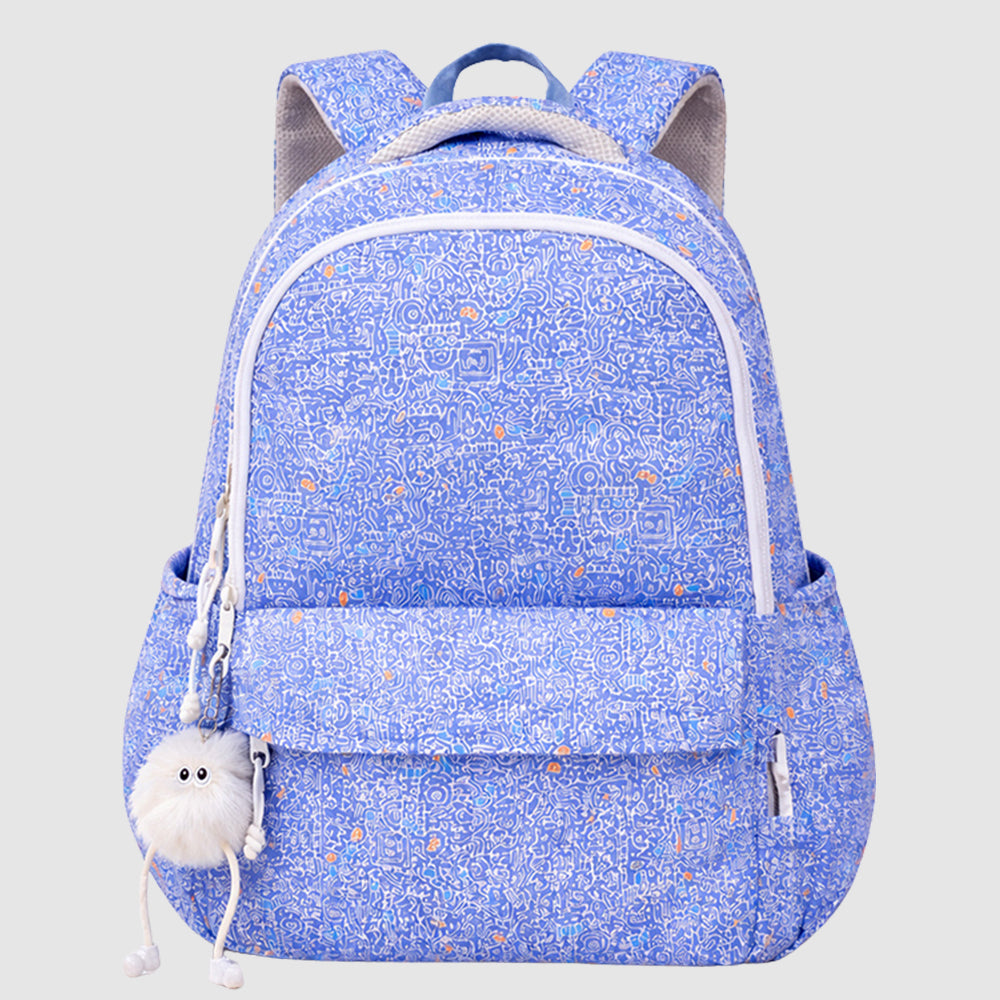 Blue Doodle Print School Backpack with Plush Pom-Pom Keychain for Kids & Teens