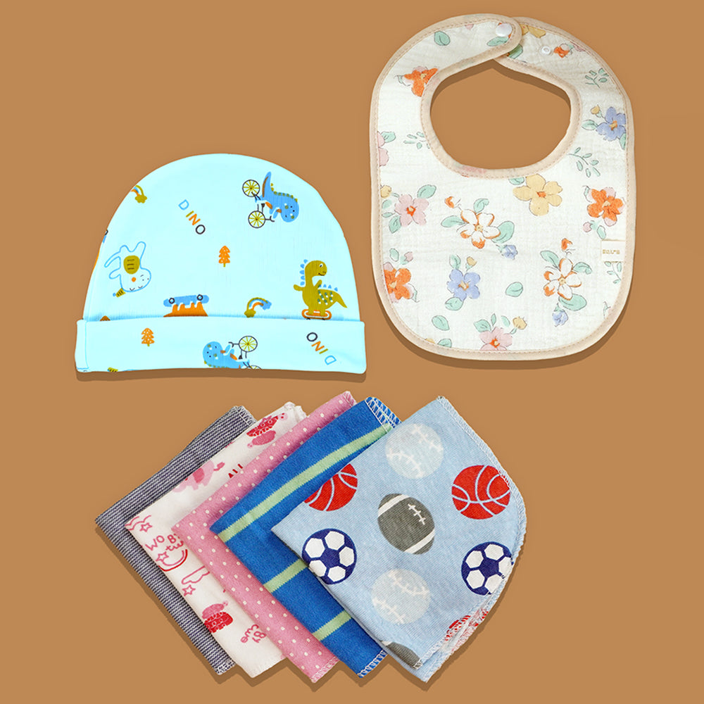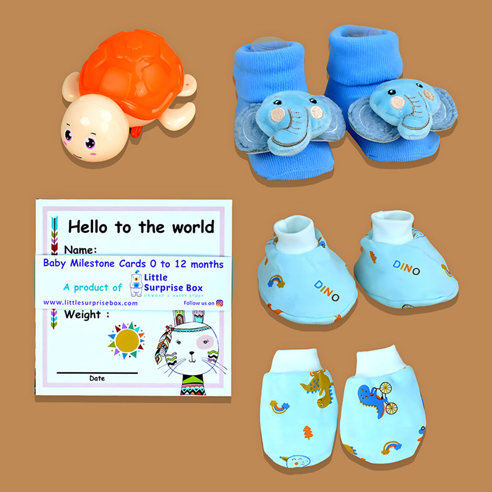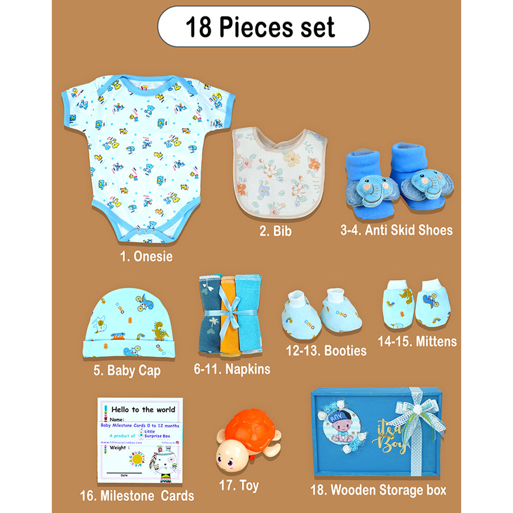 - It constitutes the following products : 1baby suit, 1 Pinewood Storage Box, 1 Newborn Cap, 1 Pair of Mittens, 1 Pair of Booties, 1 set of 24 Baby Milestone Cards (0-12 months) extremely useful for photo shoot of baby's milestones, 3Attractive Bath Toys, 1 Feeding Bib, 4 Extra soft Napkins.