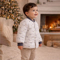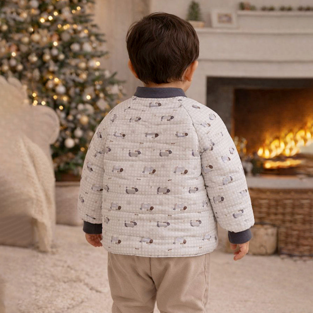 1. Cute Checked Puppy Print Design: This cosy cream winter jacket features a soft checkered pattern with adorable little puppy illustrations, giving it a warm, vintage-inspired look. The soothing beige-brown tones make it a perfect everyday winter essential for little ones.