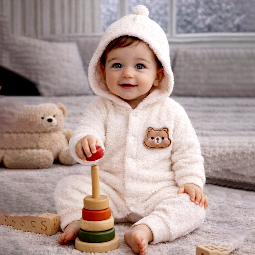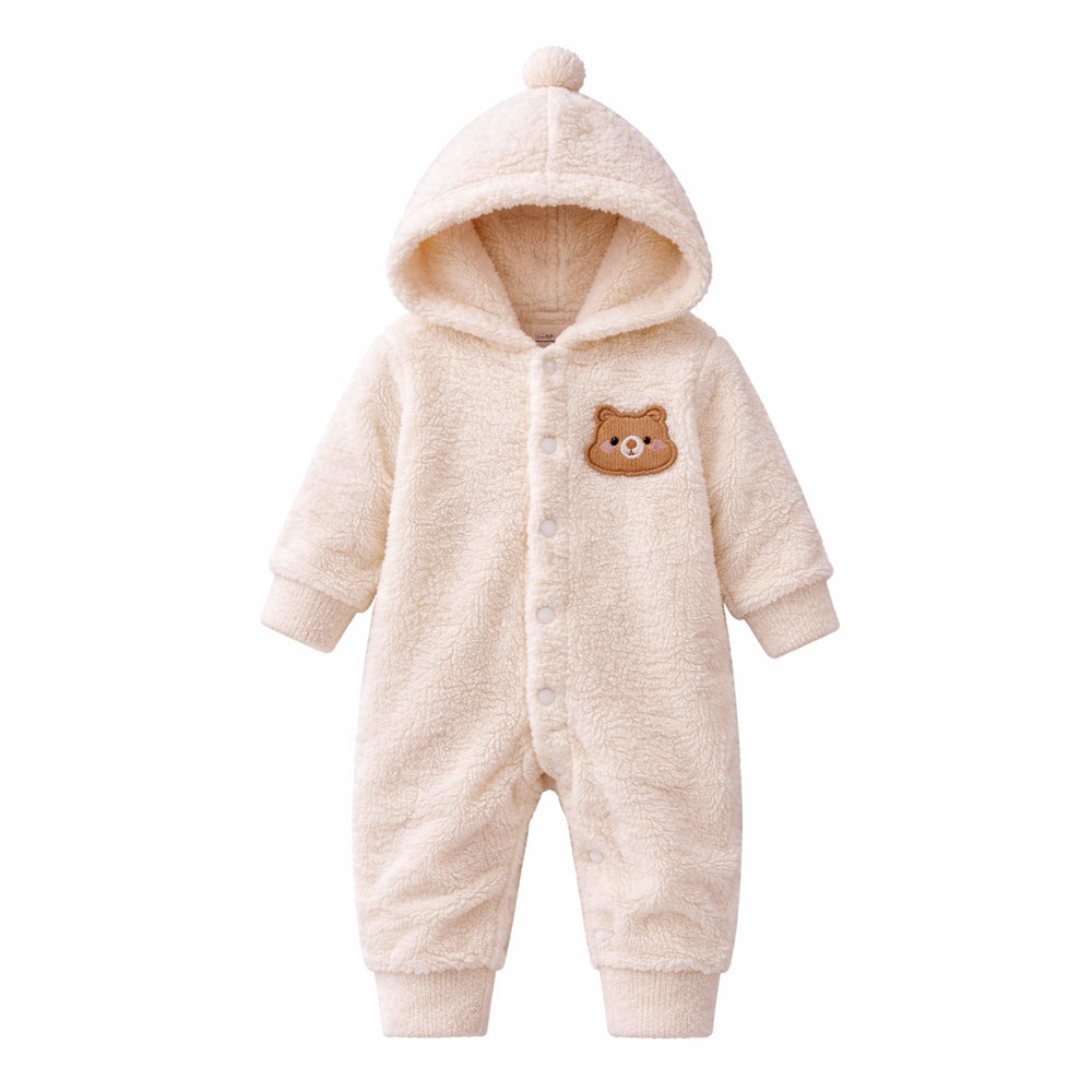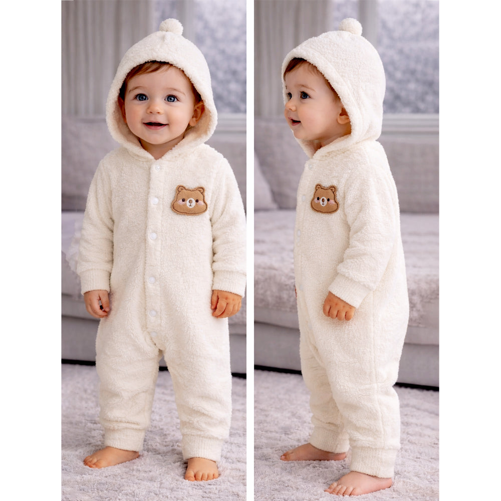 1. Adorable Teddy Hoodie Design: Dress your little one in this irresistibly cute cream hoodie romper. With its teddy detail and cozy hoody, this romper gives your baby a cuddly, warm, and picture-perfect winter look.
