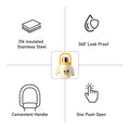 2. Premium Stainless Steel: 316 stainless Steel, The double wall insulation in premium stainless steel keeps hot drinks hot for 4 hours and cold for upto 6hours, ensuring freshness and taste.