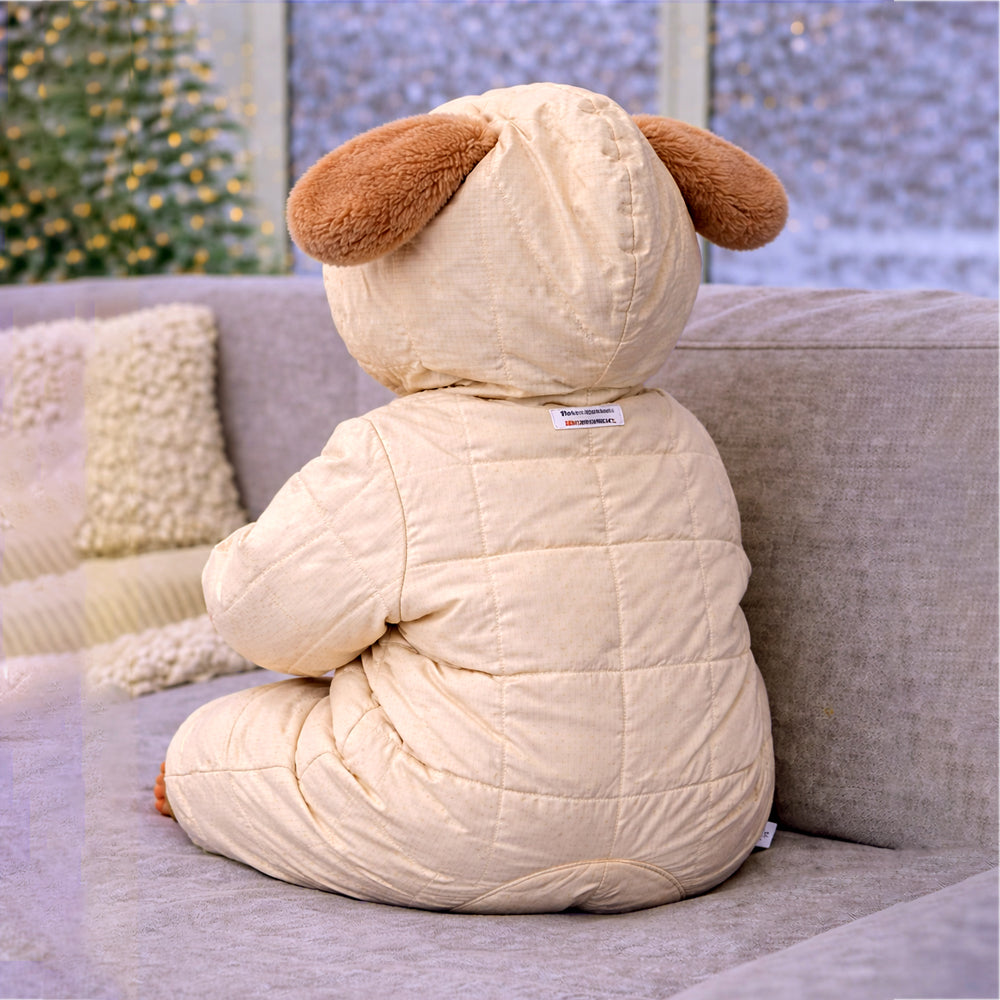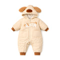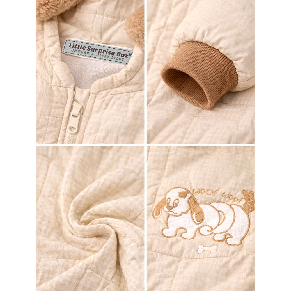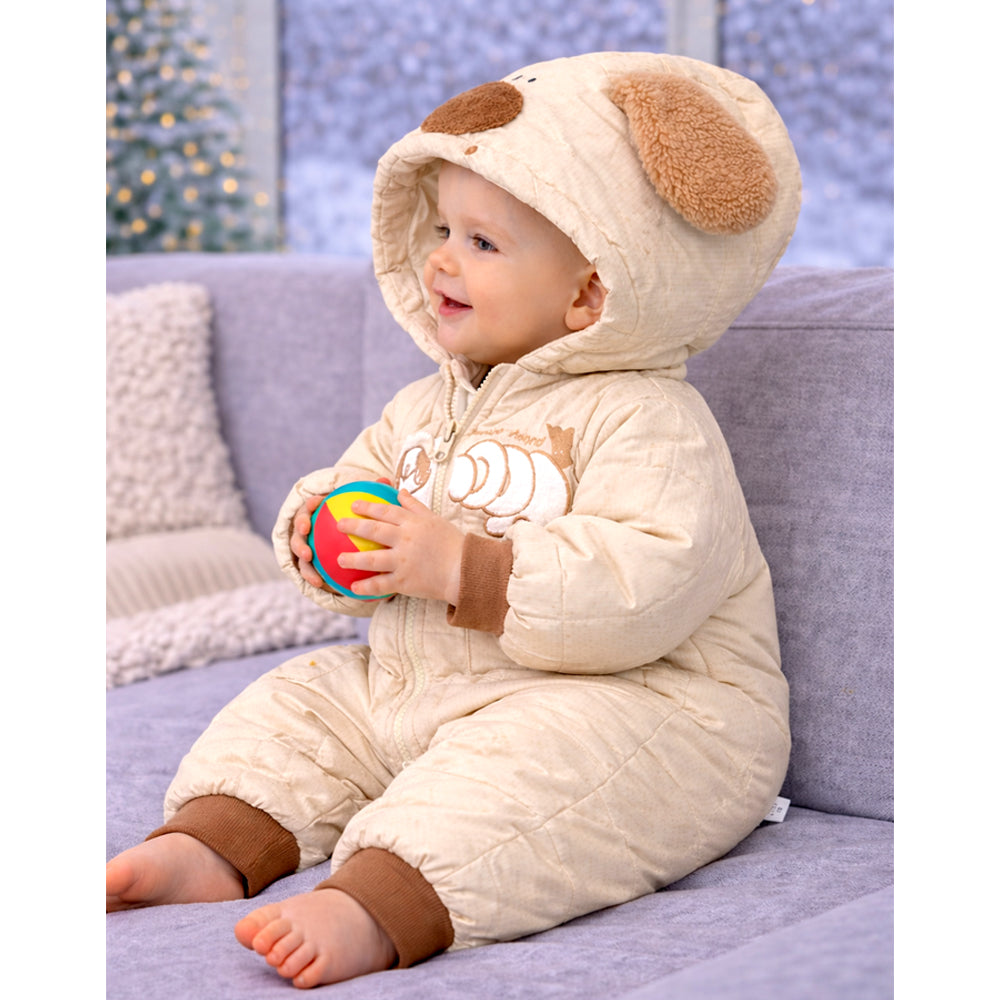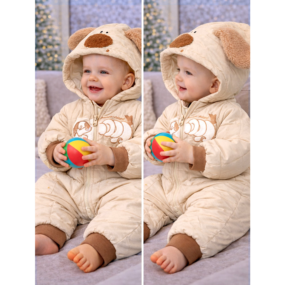 1. . Adorable Dog-Ear Hoodie Design: Dress your little one in this super cute beige winter romper featuring a plush furry hood with long floppy dog ears, a sweet dog character design and pockets. The gentle colour palette and playful detailing create a warm, charming, and picture-perfect winter look.