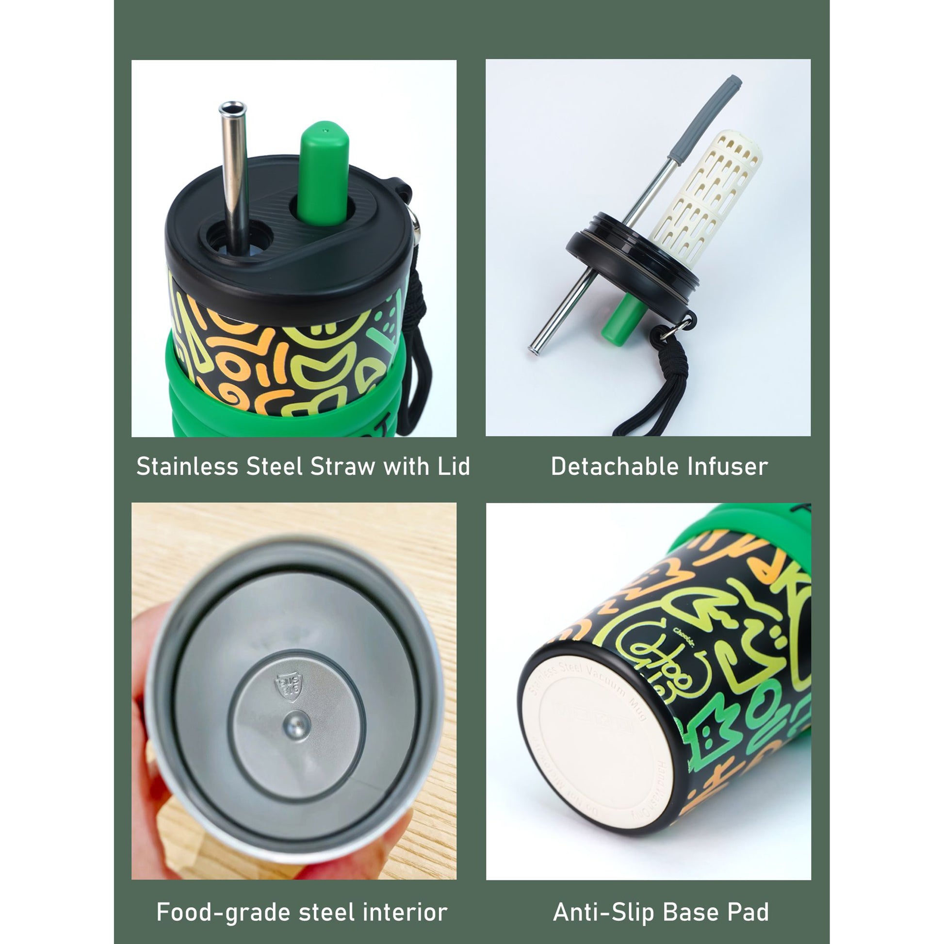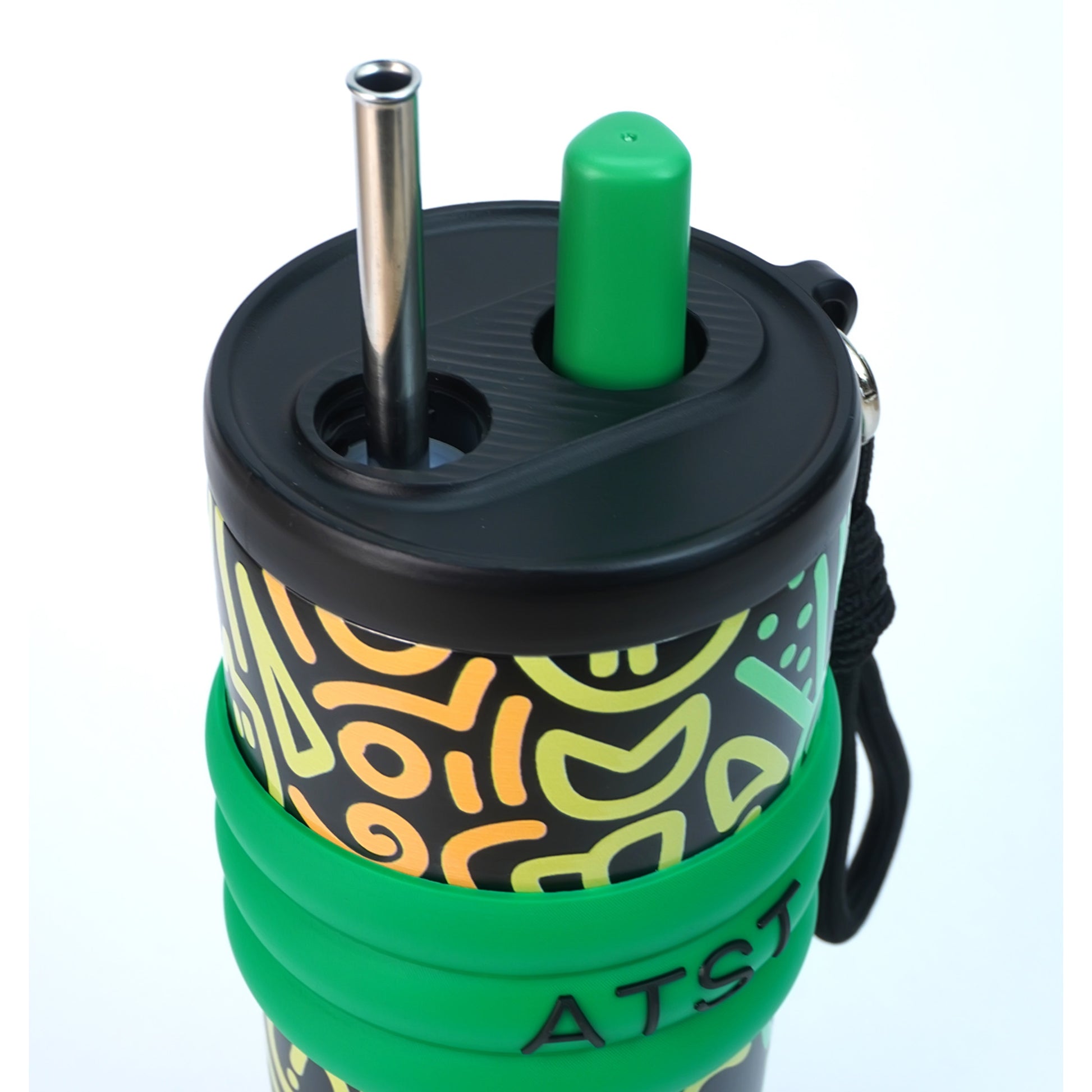 1. Design & Feature: This exclusive bottle is from the fluroscent doodle series collection. The stainless steel straw with a lid makes it really convenient to take in big sips of water with ease .The Green Doodle artwork over the black base gives this bottle a bold, eye-catching vibe. A perfect piece for the ones who love all things truly functional and yet quirky.
