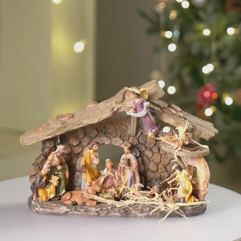 2. Intricate Details: A realistic hand-painted depiction of the Holy Family in a stable surrounded by the horse and the lamb. Each detail from the facial expressions, size of the figurines to the textures adds a divine charm to your christma home décor. The Hanging Angel holding the gloria signage brings in alot of calm and serene to the entire setting.