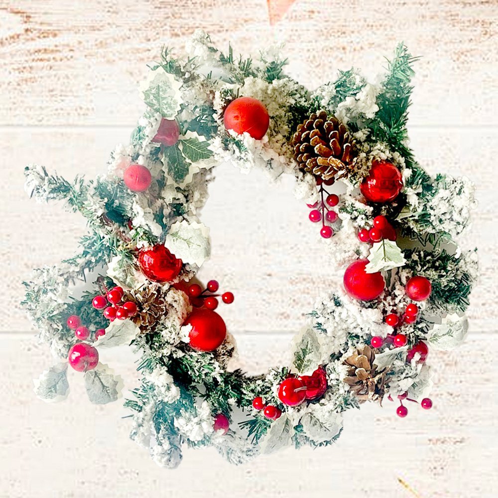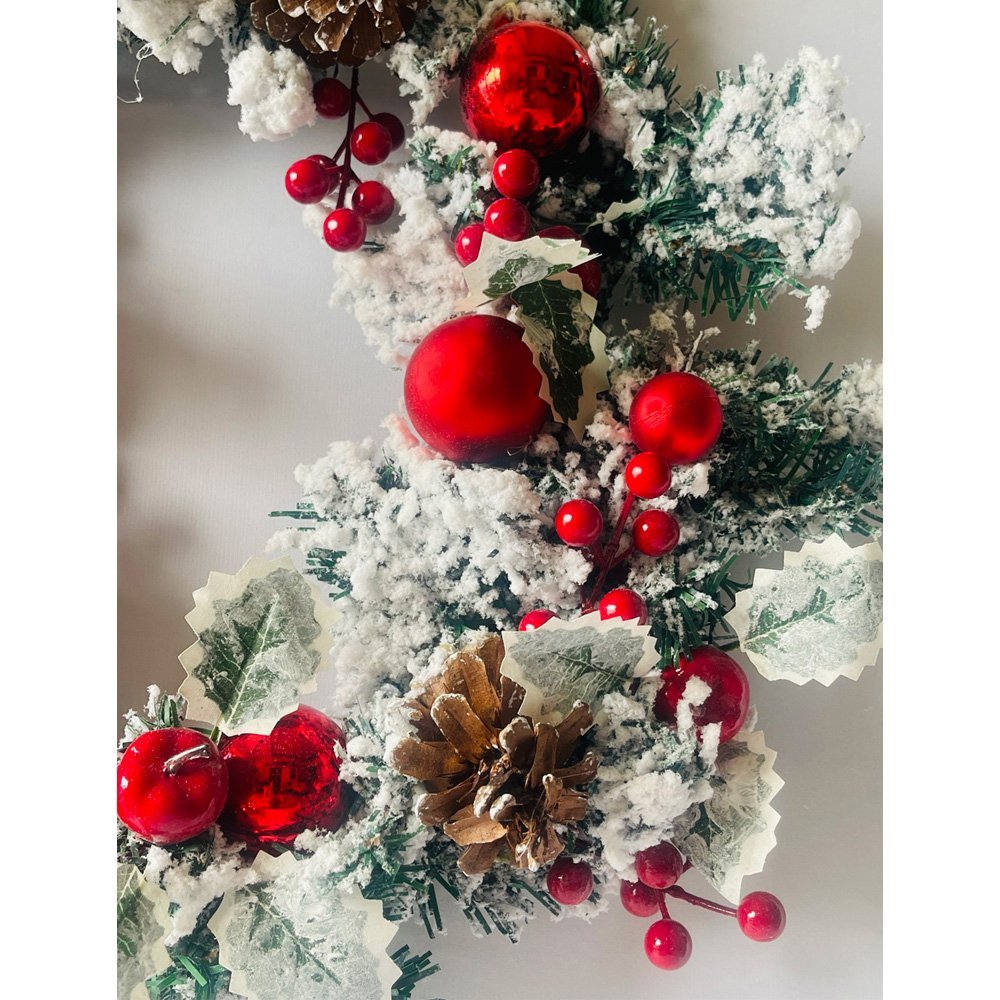 Heavy Bushy Snowy Christmas Wreath with Red cherries, pinecones and Red Ornaments