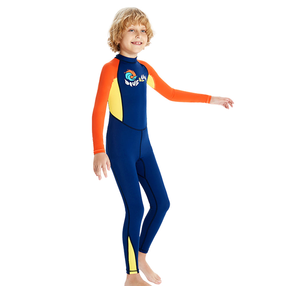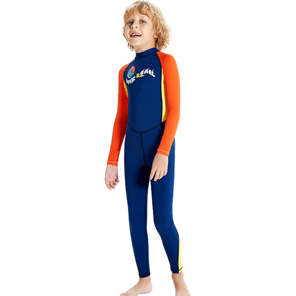 Full Length Dive Navy & Orange Printed Kids Swimwear In Upf 50+ Fabric