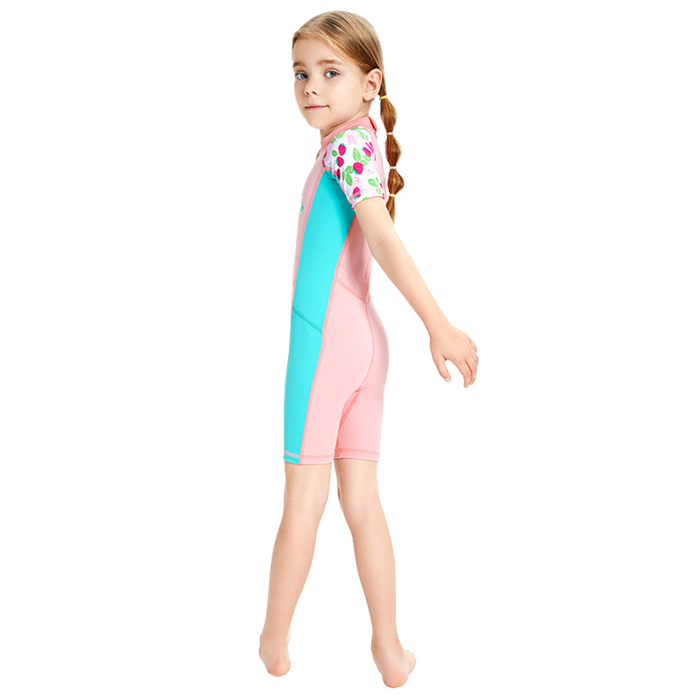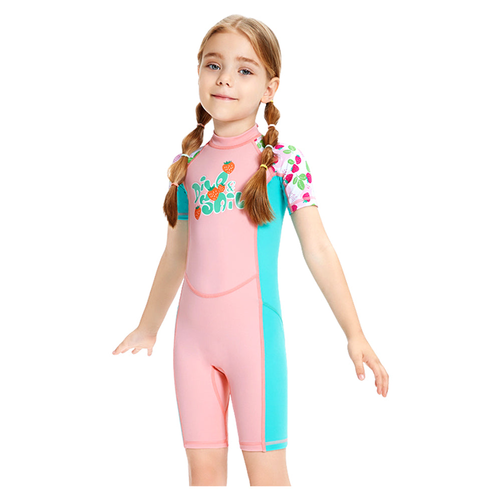 Knee Length Dive Baby Pink Strawberry Printed Kids Swimwear In Upf 50+ Fabric