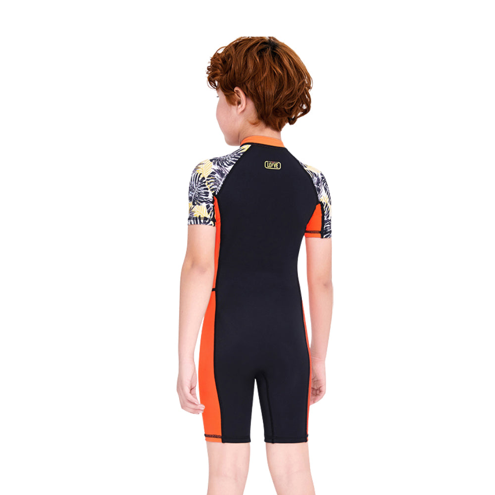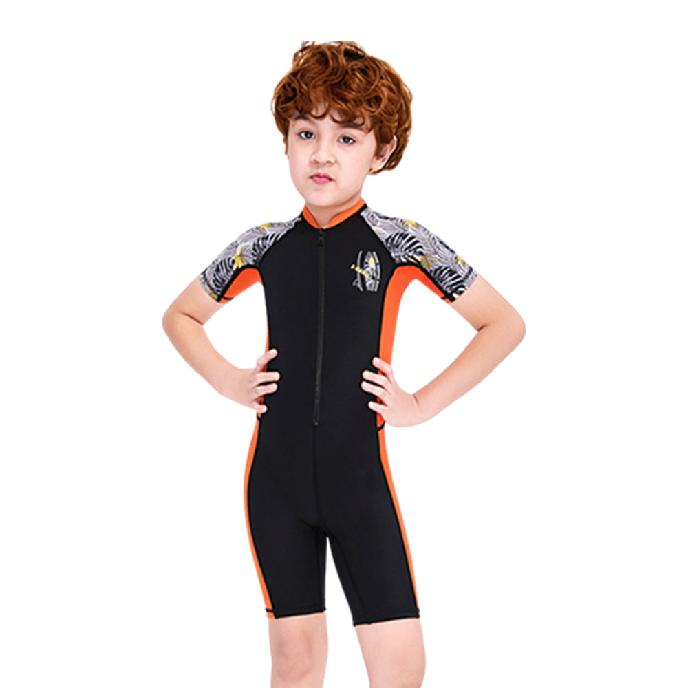 Knee Length Orange & Black Palm Leaves Printed Kids Swimwear In Upf 50+ Fabric