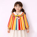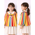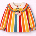 1. Design: This beautifully designed winter cardigan is perfect for little ones who love a bright, cute, and stylish look. The cardigan features bold multi-colour vertical stripes in mustard yellow, teal, red, and cream, paired with an adorable scalloped collar. The cute bow detail with pom-poms adds an extra doll-like touch, making your child look irresistibly adorable all through the winter season.