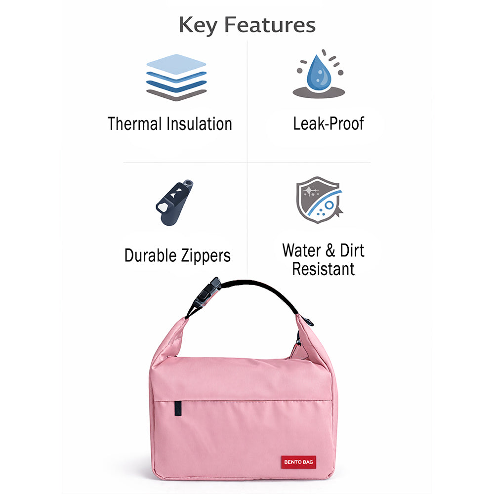 1. Design: This bento-style lunch bag comes in a soft pastel pink tone with a sleek, minimal look. Its clean and modern design makes it a stylish choice for school, office, or everyday travel.