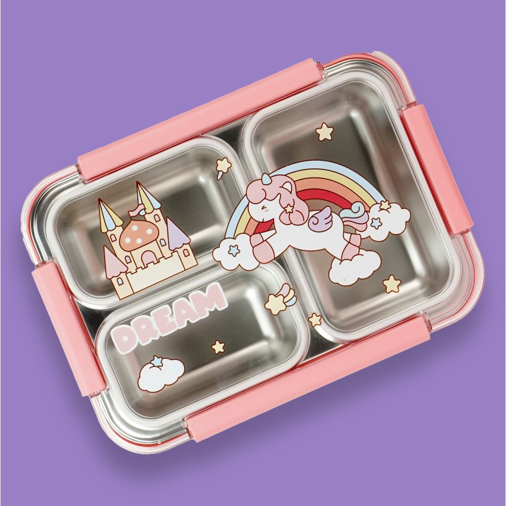 1. Design: This lunch box comes in a playful and colorful design of a Rainbow Unicorn and a princessy Castle giving the perfect Magical Vibes. The Transparent Lid makes it easy to see the contents of the Lunch Box.