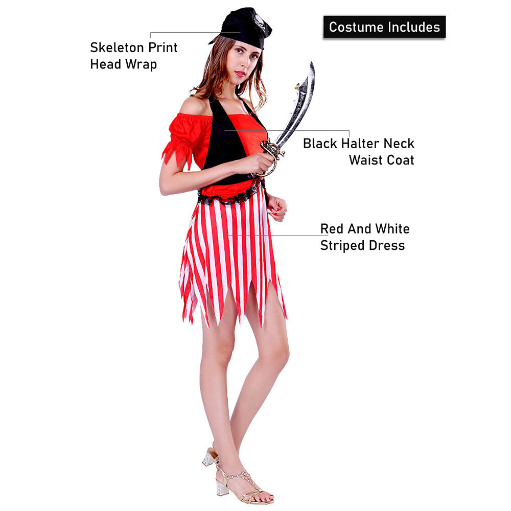 4.Accessories, 3pcs set: 1pc of skeleton print head wrap,1 pc of Red and white srtipped dress with elastic look on the shoulders and the waist to give a good fit, 1pc of black halter neck waist coat. Does not come with any hand accessory. The entire look is perfectly designed to spark imagination, turning adults into daring captains or fearless treasure hunters