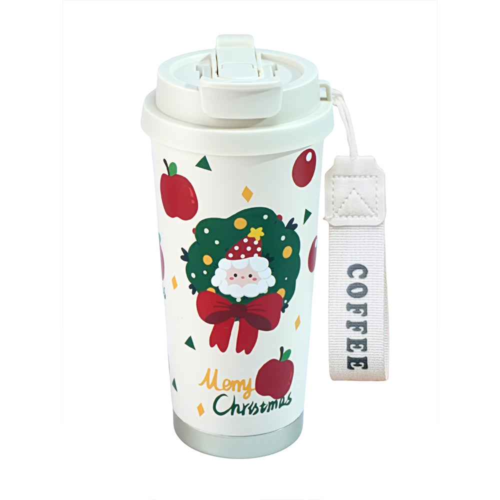 1. Christmas Designed Mug: Bring home the festive cheer with this charming Santa Wreath, Bow & Apple insulated travel mug, featuring Santa inside a decorated green wreath topped with a big festive red bow, scattered apples, stars, holly leaves, and a warm “Merry Christmas” greeting. A joyful and stylish Christmas mug for kids and adults who love festive drinkware.