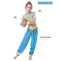4.Accessories, 3 Pcs set: 3pcs set comprises of a crop top, Harem Pants and a veil. This costume include a shiny shimmery gold and blue velvet and net top with flowy matching Harem Pants with long golden tassels which add to the charm. This set also comes along with a delicate sheer veil to complete the entire look and make it just perfect.