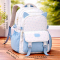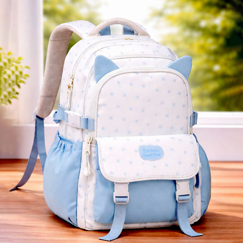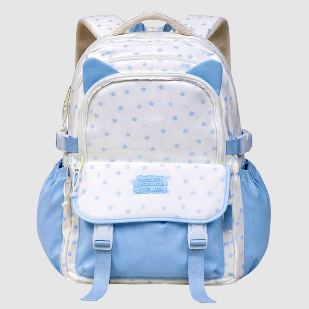 1. Star Print Backpack: This charming school backpack features an elegant all-over blue star print on a white base, enhanced with adorable ear detailing on the front pocket. The playful yet minimal design adds a cute, premium charm that kids love.