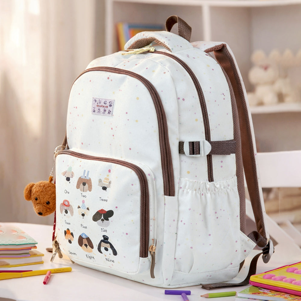 1. Dog Number Print Backpack with Keychain: This unique school backpack features a fun learning-inspired front print with cute dogs illustrations and numbers, paired with an adorable detachable plush dog keychain.