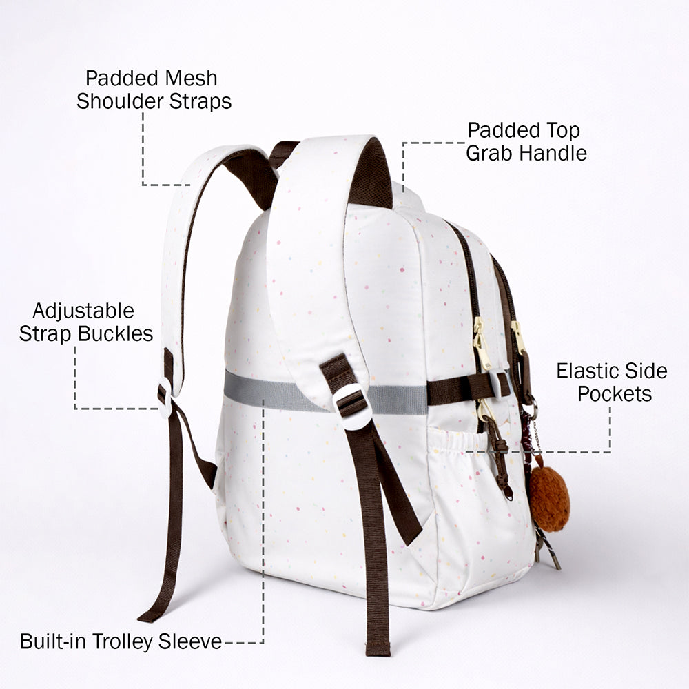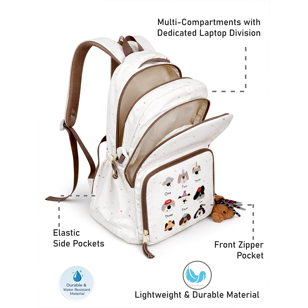 White Colorful Dots Doggy Print Backpack with Detachable Plush Dog Keychain for Kids